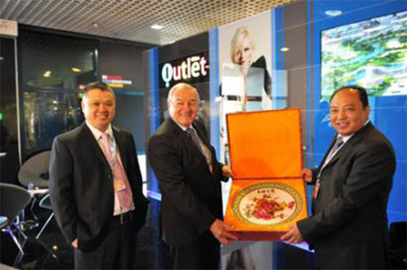 段宏濤秘書長和江萬勇高級副總裁代表中國奧特萊斯產(chǎn)業(yè)代表團向戛納市長贈送禮物