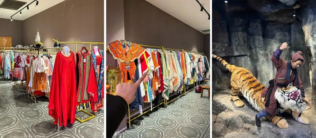 宋朝食間的另一大亮點是漢服體驗館(需付費)。除了提供宋朝傳統(tǒng)的男子常服襕衫、女子襦裙款式,也有不少經(jīng)過改良的“新中式”款式。換上古裝后,可以到多個拍照點位打卡,如武松打虎、魯提轄倒拔垂柳等經(jīng)典場景,還可以到大舞臺,看各式文藝表演。
