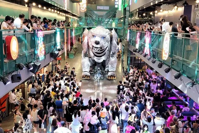 熊洞街以“大空間+小商業(yè)”為特色,匯聚了巨獸巡游、美食、娛樂、藝術(shù)、科技研學(xué)及潮玩等多元化業(yè)態(tài)。其核心IP——巨型機(jī)械白熊北北,以其震撼的體型成為街區(qū)焦點(diǎn),引領(lǐng)游客穿梭于蒸汽朋克的奇妙世界。