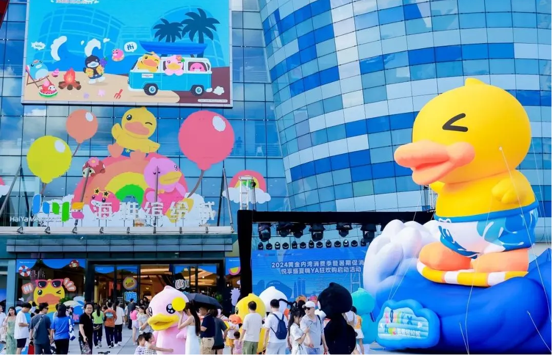 時值暑期,深圳海雅繽紛城邀請B.Duck品牌創(chuàng)辦人“鴨爸爸”許夏林,以及市/區(qū)商務(wù)局、中山商務(wù)局、新安街道辦、市零售商業(yè)行業(yè)協(xié)會等官方代表,共同開啟了2024黃金內(nèi)灣消費(fèi)季暨暑期促消費(fèi)——悅享盛夏嗨Ya狂歡購系列活動的序幕,成功完成中國第一自主IP B.DUCK小黃鴨的“B.DUCK嗨YA狂歡節(jié)全國首展”。