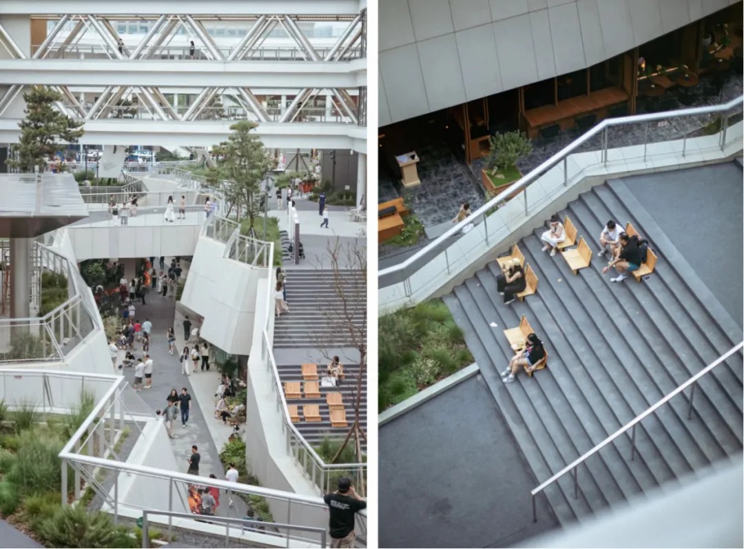 CyPARK地面層既有開闊的公共區(qū)、又有相對私密的小空間,形成了自由舒適的公園氛圍。通過各種大階梯、手扶梯等垂直交通,結(jié)合廊橋、半開放式的回廊,形成一座處處可以滲透進公園景觀的多層立體空間。
